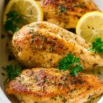 - Serve: Spoon the sauce from the bottom of the dish over the chicken, sprinkle with chopped parsley, and garnish with lemon slices if desired before serving.