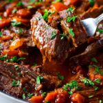 A simple and flavorful beef brisket recipe braised with sweet onions, garlic, carrots, and tomato paste, resulting in a tender and richly savory main course perfect for family dinners and gatherings.