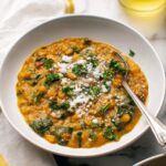 A cozy and hearty vegetarian lentil soup made with a blend of sweet potatoes, russet potatoes, carrots, and green lentils slow-cooked to perfection with aromatic herbs and spices. Finished with fresh spinach, parsley, and a touch of red wine vinegar for brightness, this warming soup is perfect for a comforting meal any day.