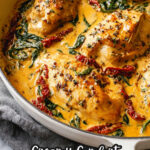 Creamy Tuscan Chicken features tender seared chicken breasts simmered in a rich and luscious sauce made with heavy cream, parmesan, garlic, sun-dried tomatoes, and fresh baby spinach. This Italian-inspired dish is perfect for a comforting dinner and combines bold, savory flavors with a creamy texture.