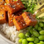 - Assemble the bowls: Divide cooked rice into serving bowls. Top with the sticky tofu, steamed edamame, and sliced avocado. Garnish with sesame seeds and spring onions, and drizzle additional sticky sauce over the assembled bowls. Serve immediately.