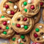 These Santa's Cookies are soft and chewy double chocolate chip M&M cookies made with vanilla pudding mix for extra moisture and flavor. Perfect for holiday celebrations, they are packed with semi-sweet and white chocolate chips, along with festive red and green M&M candies for a colorful and delicious treat.