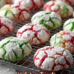 Festive and colorful Christmas Crinkle Cookies made from a white cake mix, perfect for holiday celebrations. These soft, chewy cookies are dipped in powdered sugar and baked to a delightful crinkled texture with vibrant red and green colors.