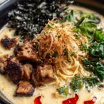 Fiery chicken ramen with creamy garlic sauce is a spicy and comforting dish featuring tender chicken breast pieces simmered in a velvety broth enriched with heavy cream and infused with bold garlic and chili flavors. This easy-to-make ramen combines the warmth of chicken broth, the richness of cream, and the heat from chili sauce, finished with fresh green onions and toasted sesame seeds for a satisfying, flavorful meal.