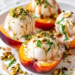 Delight in the juicy sweetness of grilled peaches paired with creamy vanilla ice cream, drizzled with caramel sauce and topped with crunchy pistachios and fresh mint. This simple and elegant dessert is perfect for summer gatherings and ready in just 25 minutes.