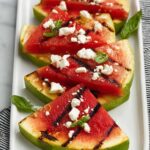 - Assemble and Serve: Arrange the grilled watermelon wedges on a serving platter. Sprinkle crumbled feta cheese over the top and garnish with torn fresh basil leaves before serving.