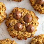 - Shape Cookies: Line a baking tray with parchment paper. Scoop the dough into 8 equal portions and shape each into a cookie on the tray. Press the remaining chocolate chips onto the tops of the cookies if using.