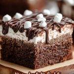 A decadent Hot Chocolate Poke Cake featuring a moist devil's food cake filled with marshmallow fluff, rich hot fudge, and topped with a creamy hot cocoa whipped topping, garnished with mini marshmallow bits for the perfect winter dessert.
