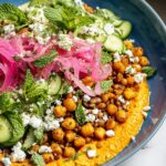 - Assemble the Bowls: Place a big scoop of the feta sauce on one side of a shallow bowl, spooning it around nicely. Add a ½ cup scoop of cooked rice on the other side. Top part of the feta sauce with ¼ cup of roasted chickpeas, then place a scoop of the spiced ground chicken in the middle. Add chopped cucumbers and pickled red onion on top.