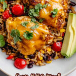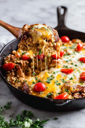 This One-Pot BBQ Chicken and Rice recipe is a flavorful and easy weeknight dinner that combines tender chicken thighs with smoky BBQ sauce, hearty rice, and vegetables all cooked together in a single skillet. Topped with melted colby jack cheese and fresh avocado, tomatoes, and herbs, it’s a comforting meal full of bold flavors and minimal cleanup.