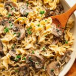 A classic 30-minute beef stroganoff recipe featuring tender seared steak, sautéed mushrooms and onions, and a creamy garlic mushroom sauce, served over wide egg noodles. Perfect for a comforting and quick dinner.