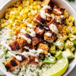 This Street Corn Chicken Rice Bowl features tender marinated chicken thighs paired with grilled sweet corn, zesty lime, creamy Cotija cheese, and a flavorful chili-spiced sauce. It’s a vibrant, satisfying dish perfect for a fresh and customizable meal.