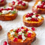 Sweet Potato Bites With Honey and Feta are deliciously roasted sweet potato rounds coated with aromatic herbs and spices, then topped with sweet honey, salty feta cheese, tangy pomegranate arils, and fresh parsley for a perfect balance of flavors. This appetizer is easy to prepare and perfect for entertaining or a tasty snack.
