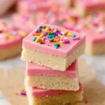 These Vegan Sugar Cookie Bars feature a soft, buttery texture with a sweet pink vegan buttercream frosting. Easy to prepare and perfect for customizing with vegan-friendly food coloring and sprinkles, they make a delightful treat for any holiday or special occasion.
